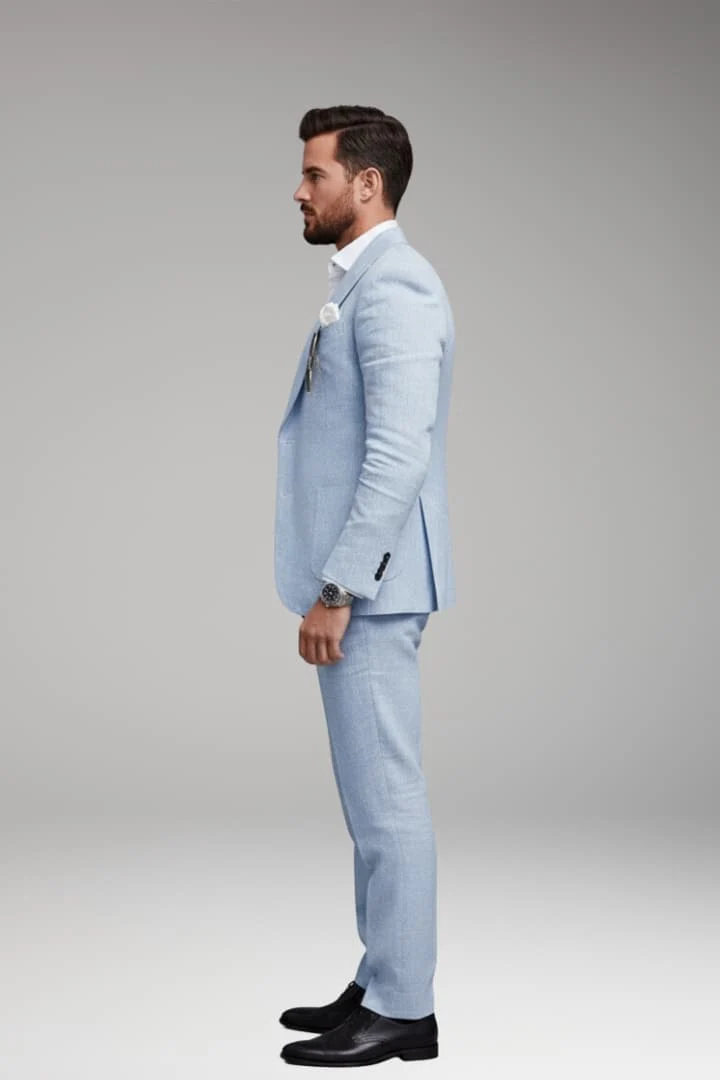 This refined ensemble includes a single-breasted blazer with a notched lapel and coordinated straight-cut trousers. The blazer is finished with a front button closure and flap pockets for a classic silhouette. Crafted with a lightweight woven fabric, this suit delivers a clean, polished look ideal for summer occasions, weddings, or semi-formal gatherings.