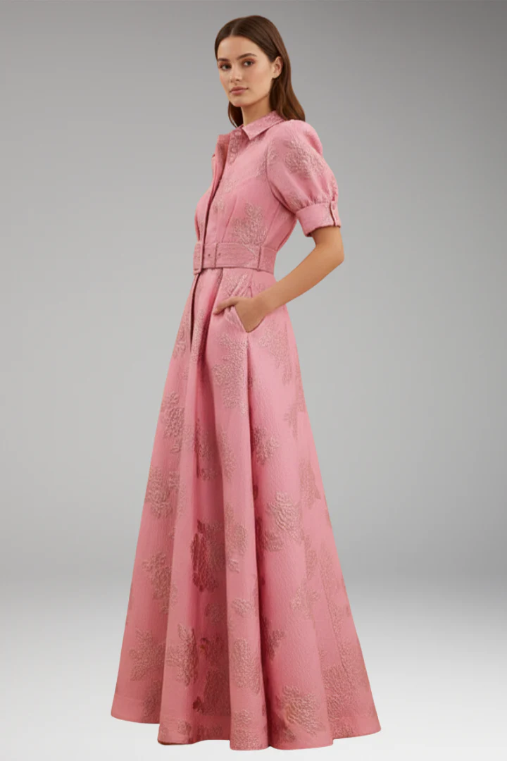 Women’s maxi dress with collared neckline, short sleeves, and adjustable waist belt